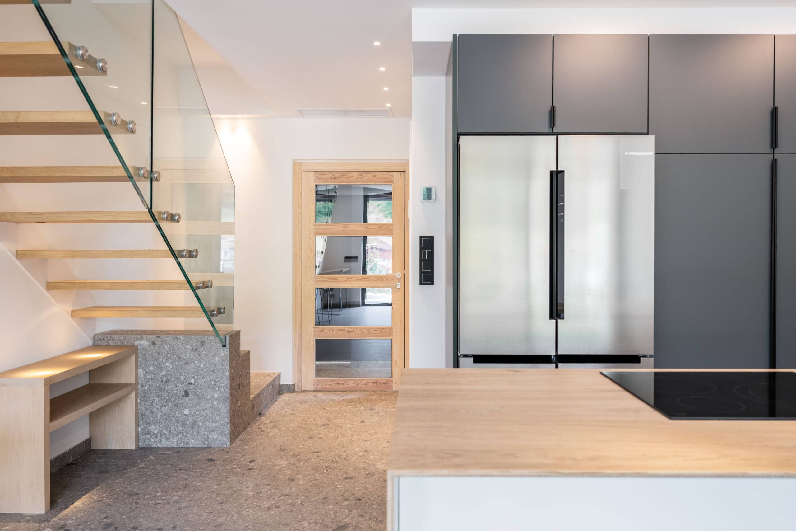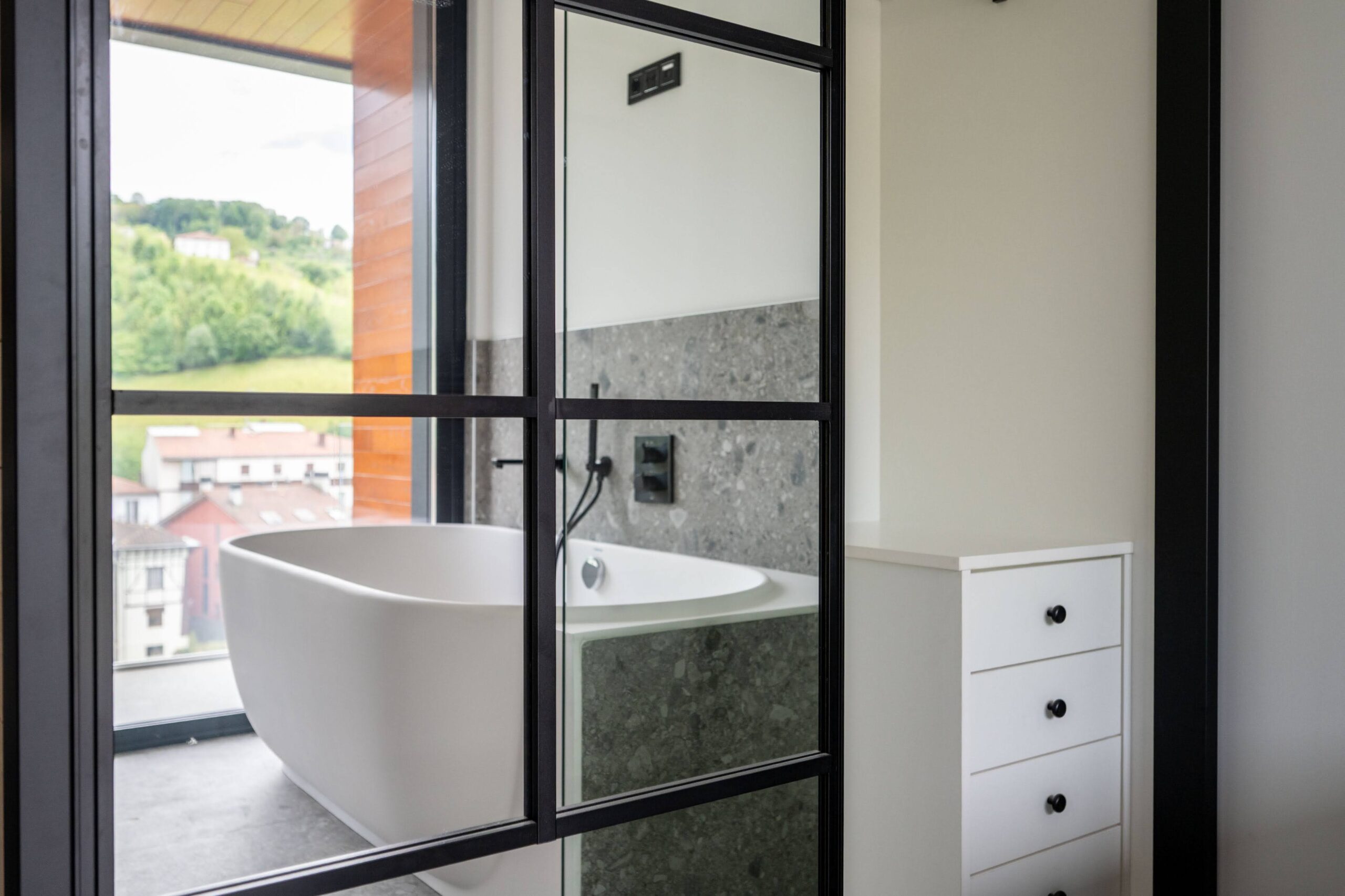 Kanpoko arotzeria PVCzko leihoez eta ateleihoez osatua dago, transmitantzia baxuko 3 beiraz osatuta eta ingurua gaztainezko egurrez estalia goxotasuna lortzeko.